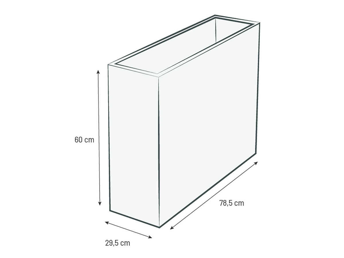 - Was ist der Vorteil eines rechteckigen Pflanzkübels mit einer Höhe von 60 cm?Dank seiner Höhe von 60 cm eignet sich dieser Pflanzkübel ideal für Pflanzen mit tieferen Wurzeln oder um einen gestaffelten Effekt zu erzielen. Das rechteckige Format (78,5 x 29,5 cm) macht ihn perfekt für die Platzierung an Mauern oder Brüstungen.