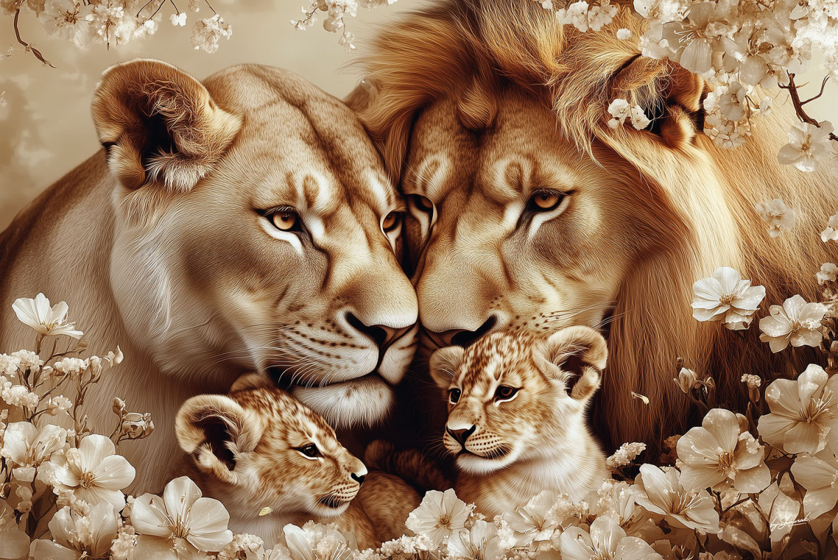 Ter Halle Glass Painting Signed Lion Family - 80 x 120 cm