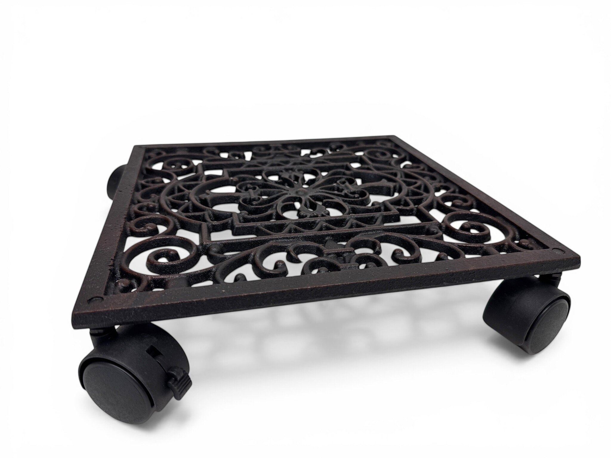 - Fabriqué en fonte robuste et durable, idéal pour un usage intensif. Équipé de 4 roues pour une liberté de mouvement à 360°. Idéal pour une utilisation intérieure et extérieure grâce à son matériau résistant aux intempéries. Protège les sols et les terrasses des rayures et des taches dues au contact direct avec le pot. Apporte une touche rustique et intemporelle à votre collection de plantes.