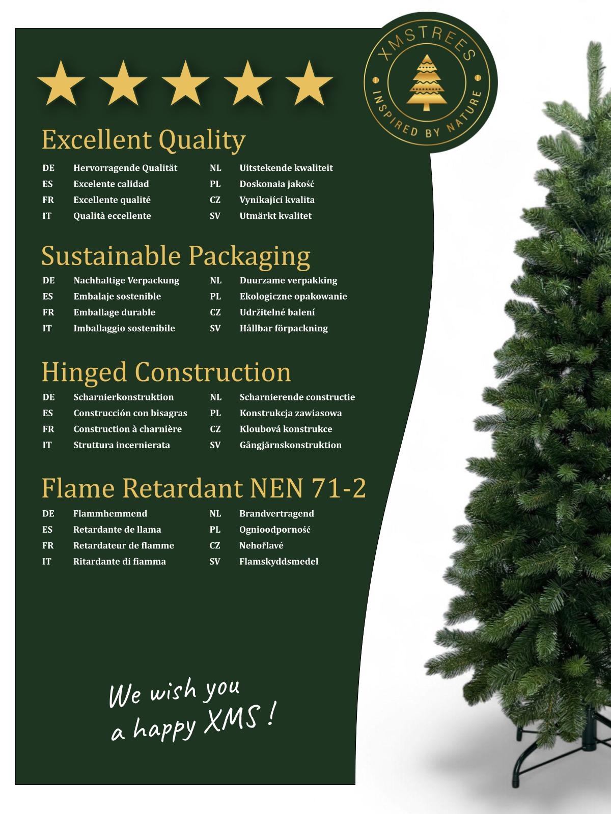 De kerstboom voldoet aan alle relevante veiligheidseisen en normen (NEN 71-2). Het materiaal is brandvertragend behandeld, waardoor de boom veilig in huis kan staan, zelfs in de buurt van verlichting of decoratie.